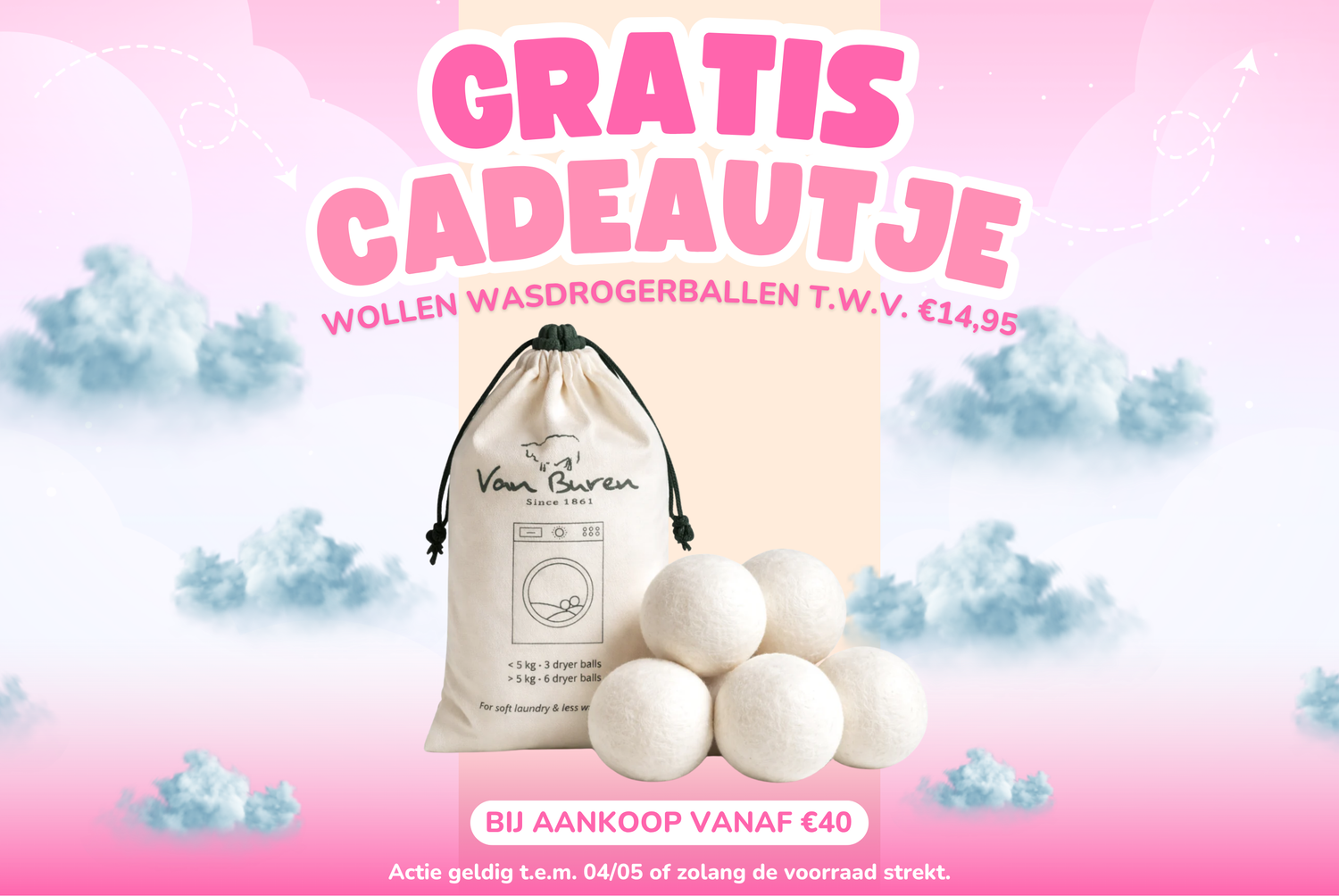 Bij aankoop vanaf ā¬40 krijg je nu GRATIS wollen wasdrogerballen t.w.v. ā¬14,95 helemaal GRATIS!