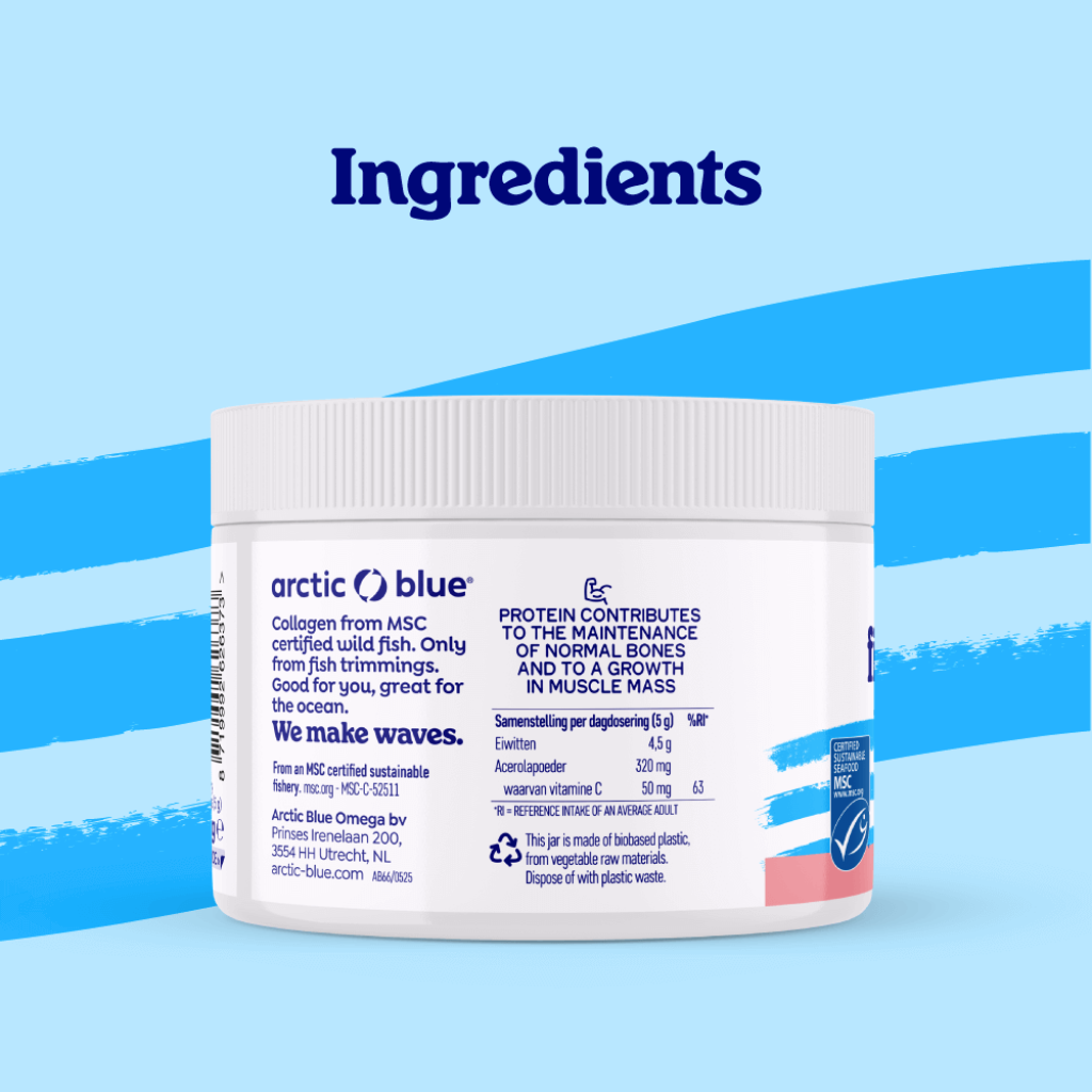 Viscollageen van Arctic Blue is een supplement met collageen afkomstig uit vis. Collageen is een belangrijk structureel eiwit in het menselijk lichaam en speelt een rol bij de opbouw en het behoud van huid, botten, kraakbeen en bindweefsel. De natuurlijke aanmaak van collageen neemt af naarmate je ouder wordt. Met dit supplement vul je je dagelijkse voeding aan met een extra bron van collageen.