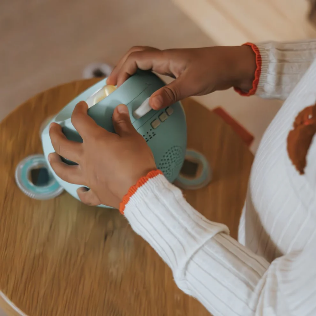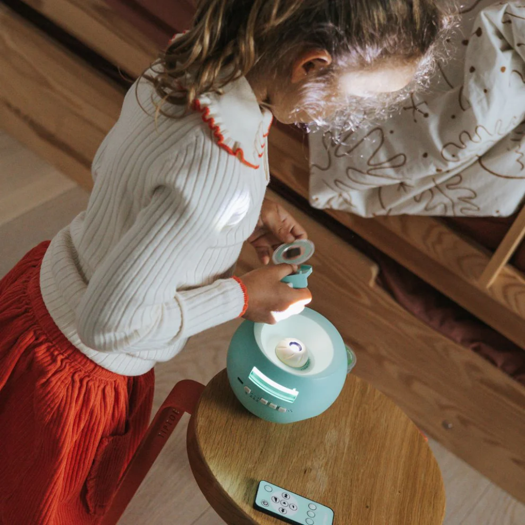 Je bedient alles makkelijk met de afstandsbediening en dankzij de oplaadbare batterij met USB‑C-oplader is hij ook nog eens handig in gebruik. In het bijgeleverde boekje staan leuke weetjes over de beelden, perfect om samen nog even in te bladeren voor het slapen.