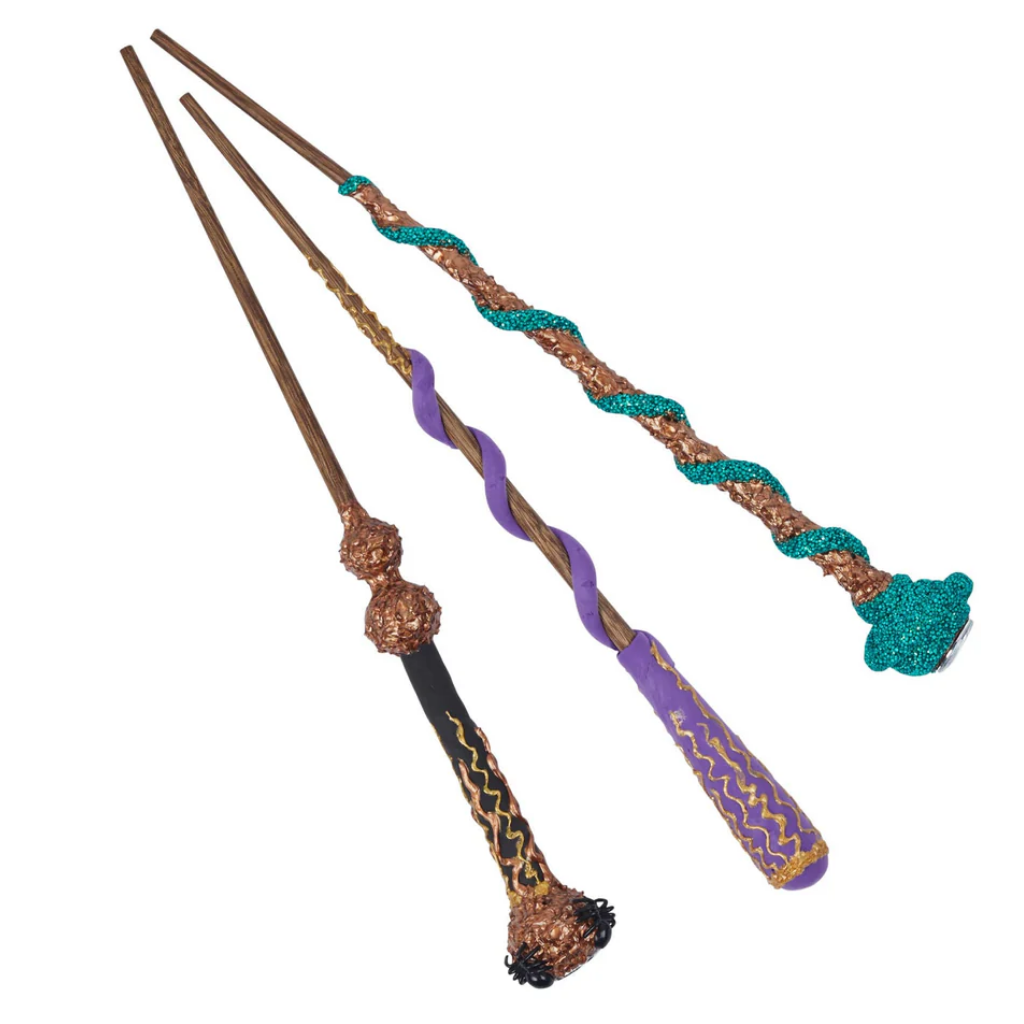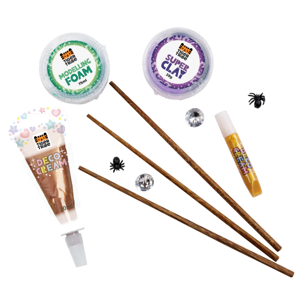 De set bevat 3 houten toverstokken die versierd kunnen worden met klei, foam, glitter en leuke details zoals spinnen en juwelen. Dankzij de duidelijke stap-voor-stap instructies kunnen kinderen zelfstandig aan de slag.