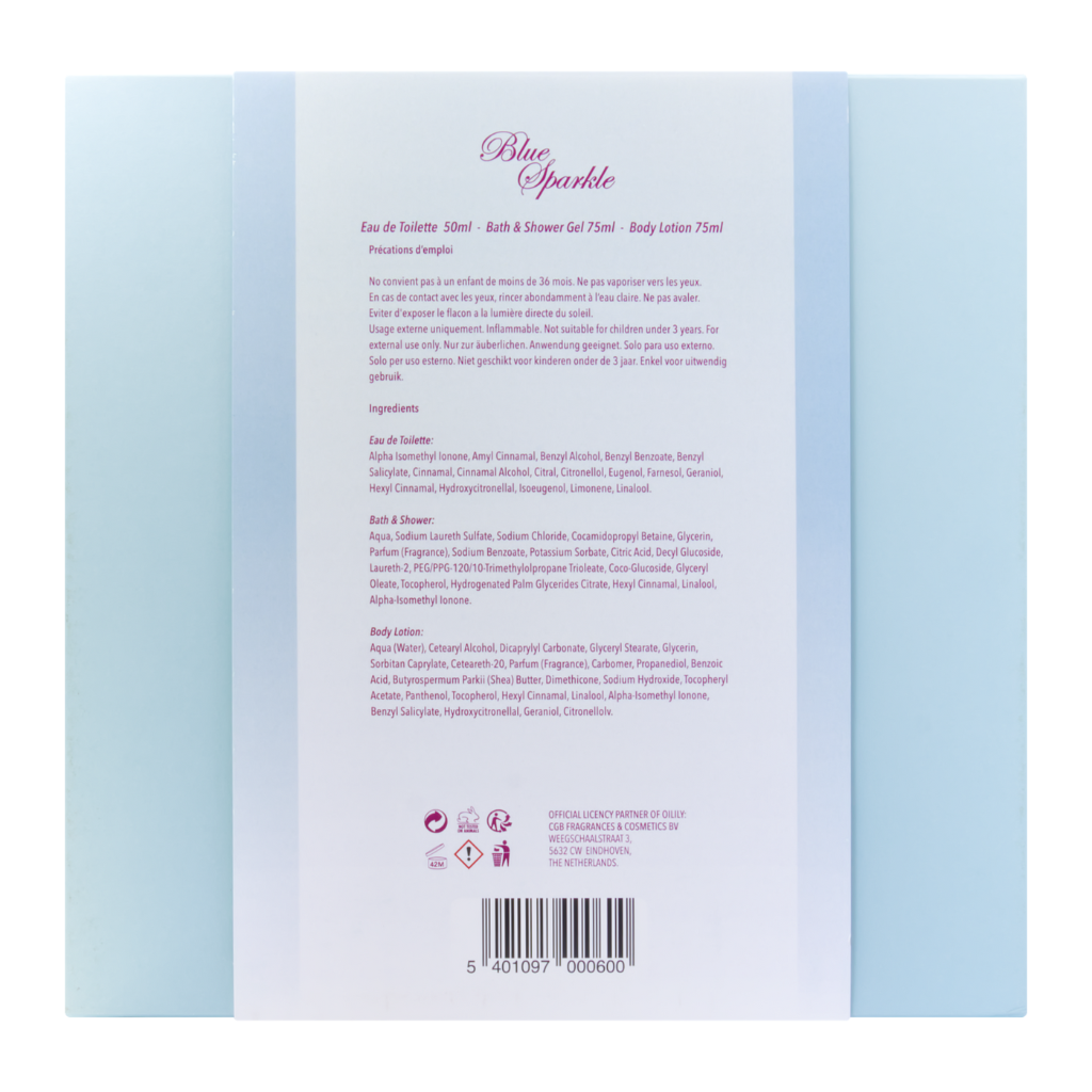 De kristalheldere azuurblauwe flacon en sprankelende geur creëren een aura van energie en optimisme. Dankzij de zorgvuldige selectie van hoogwaardige ingrediënten is de Blue Sparkle perfect geschikt voor dagelijks gebruik en schittert het op elke gelegenheid.