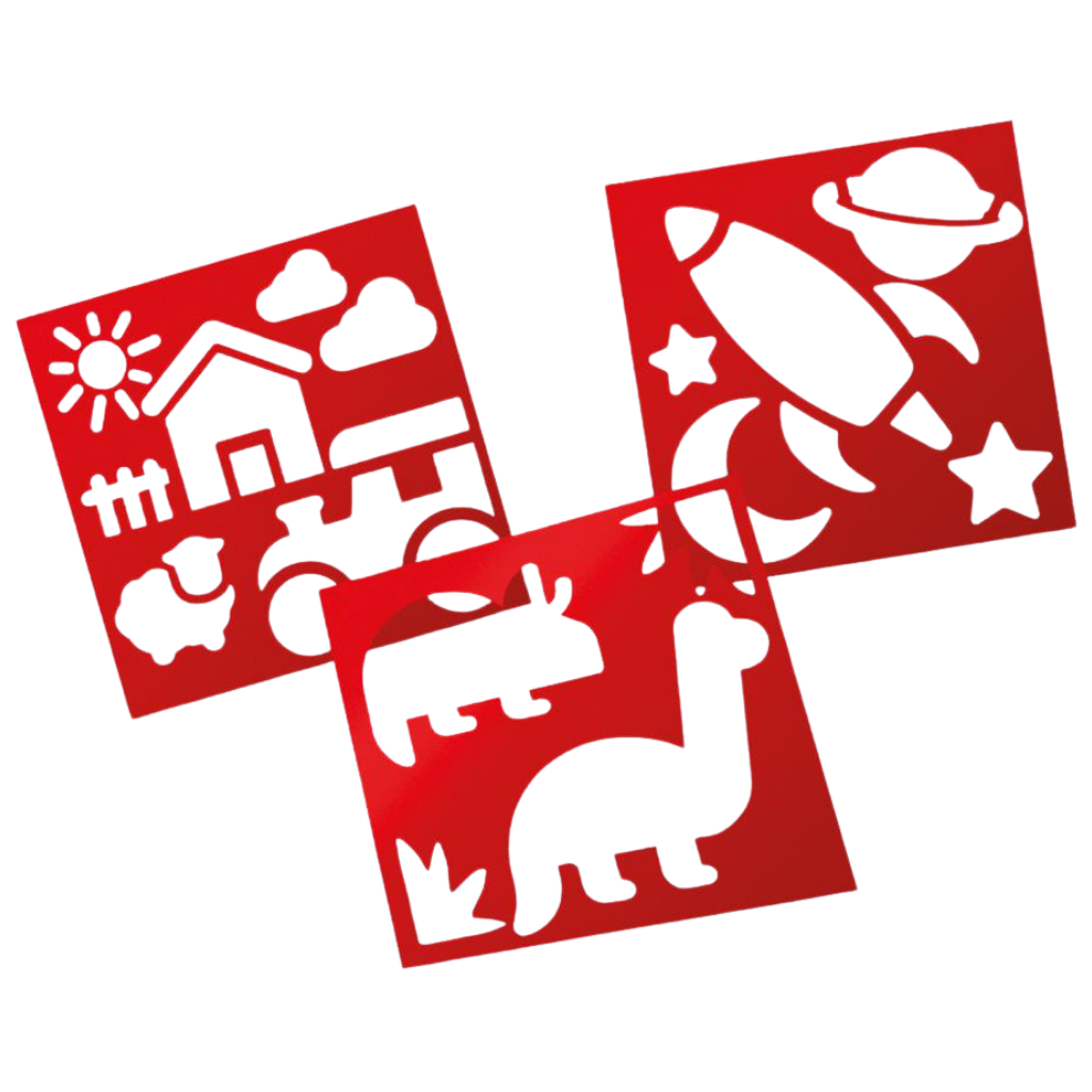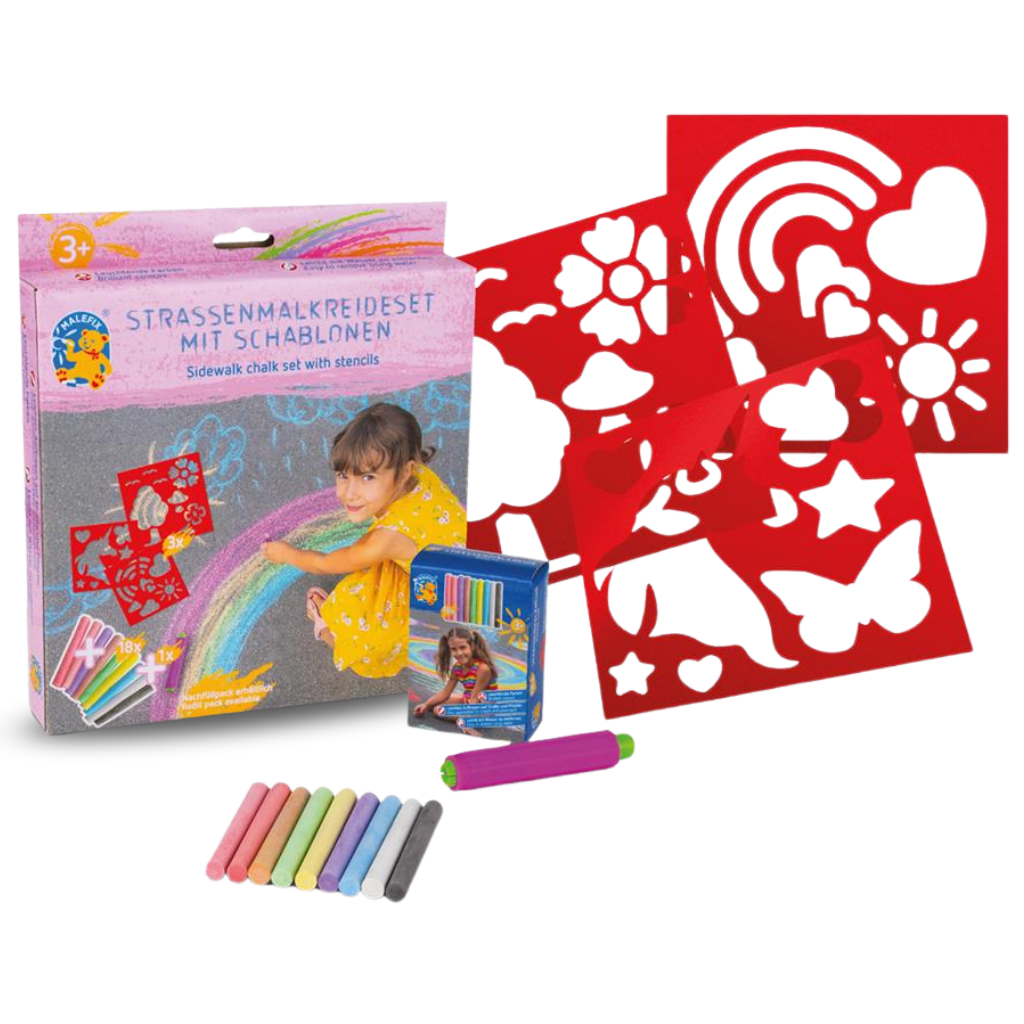 De set bevat kleurrijk stoepkrijt en sjablonen met thema-motieven, waardoor je in ƩƩn keer duidelijke en leuke vormen op de grond kunt zetten.