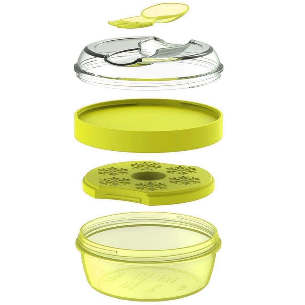 De herbruikbare koelschijf klik je in de deksel en houdt je snack tot 2 uur koel. Handig voor onderweg en beter dan kant-en-klare snacks. De hele box (excl. koelschijf) kan in de vaatwasser en magnetron, dus ook makkelijk schoon te houden.