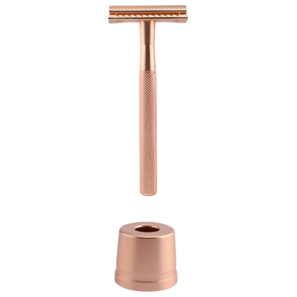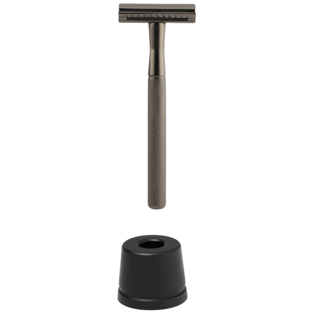 Safety razor van duurzaam metaal. De houder bevat een anti-slipbodem voor stabiele plaatsing. Mesjes zijn eenvoudig vervangbaar. Geschikt voor nat scheren.